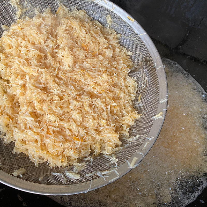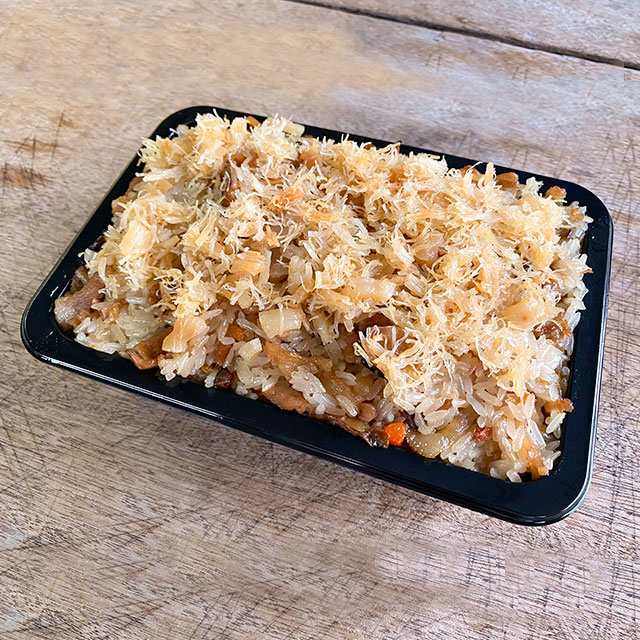 鋪上滿滿的干貝絲,古早味油飯搭配干貝絲,美味更加倍唷!